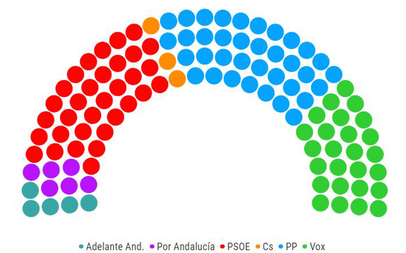 Vox alcanza más diputados que la suma de Por Andalucía (8,4%) y Adelante Andalucía (6,6%). La coalición de la que forman parte Izquierda Unida y Podemos obtiene 6 diputados frente a los 5 que alcanza Teresa Rodríguez.