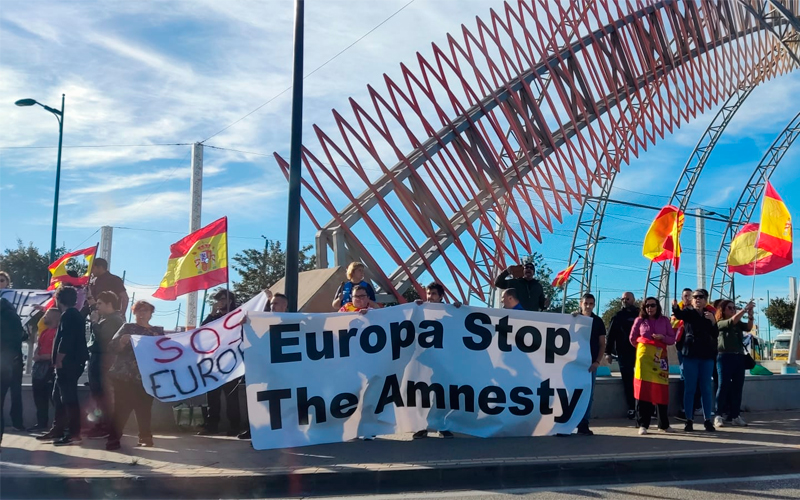Un grupo de manifestantes continúa reclamando que Europa actúe contra la futura ley de amnistía acordada en el pacto entre PSOE y Junts. En las pancartas podía leerse ‘Europa stop the amnesty’ o ‘SOS Europe’.