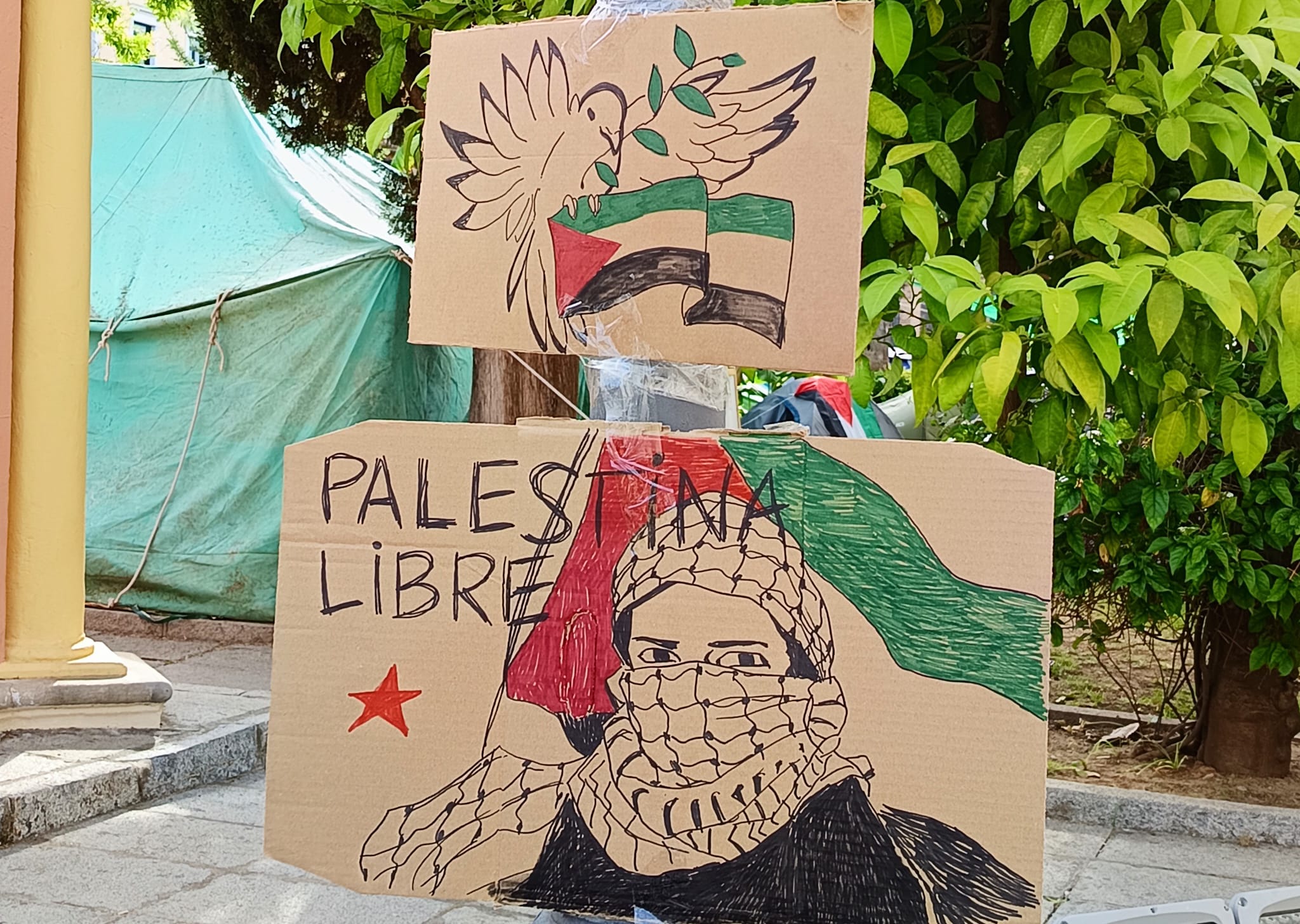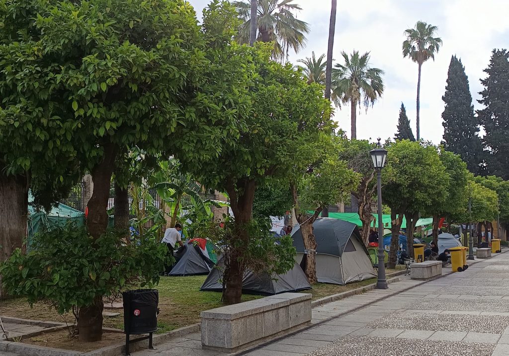 En España, la voz de los estudiantes por una Palestina libre se alzó primero Valencia, le siguieron Cataluña, Madrid o Andalucía. Antes de replicarse en otras provincias del sur, Granada fue el epicentro de la movilización. En la capital andaluza, la sede del Rectorado, ubicada en la Antigua Real Fabrica de Tabacos, convive desde el pasado día 13 con la acampada de estudiantes a sus puertas. Su ubicación, la céntrica calle San Fernando aporta una gran visibilidad a las reivindicaciones de estos jóvenes estudiantes: “La gente está colaborando gigantescamente, se acercan a la mesa, nos preguntan. Hablamos con personas de otras nacionalidades que se suman a la causa, nos reconocen el esfuerzo, nos desean mucha suerte e incluso nos hacen donaciones.”