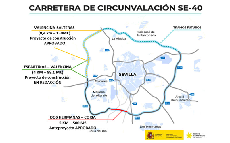 Además, el tramo contiguo del anillo hacia el sur Espartinas-Valencina, se encuentra en fase de redacción del proyecto de construcción, estando próxima su aprobación.