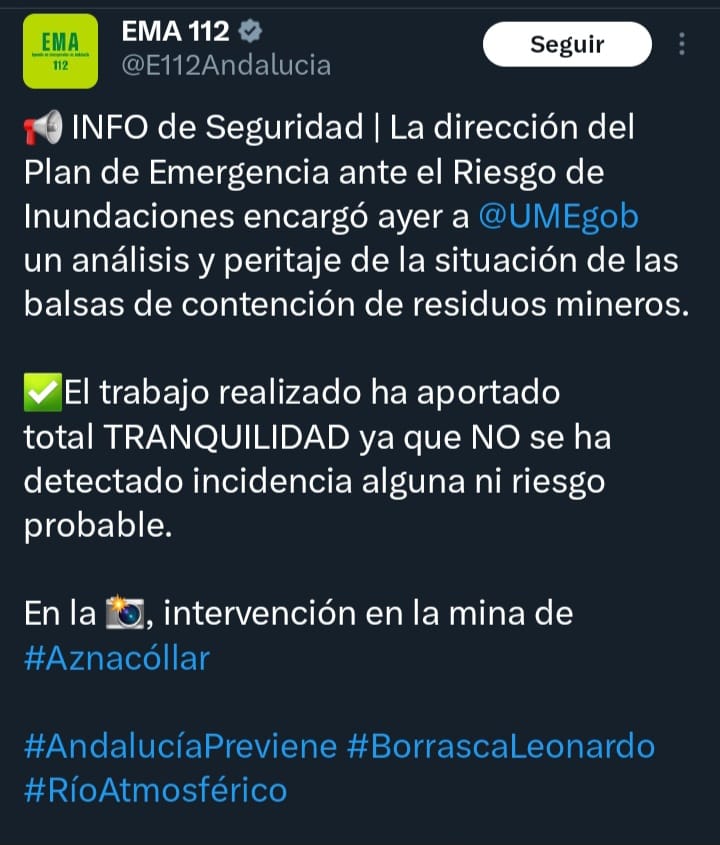 Finamente, el 112 ha descartado el riesgo de vertido en la Mina de Aznalcóllar tras el despliegue de la UME debido a la borrasca Leonardo.