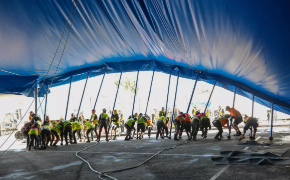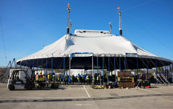 Conocido como «Big top push» (así se denomina el alzamiento la enorme carpa de 52 metros de diámetro y 19 de altura), ha sido posible gracias al trabajo de más de un centenar de personas encargadas de la elevación. Además, es sostenido a través de cuatro mástiles con una altura de 25 metros y se han necesitado unas 1.200 estacas para poder anclarla en su sitio. El sistema utilizado para el levantamiento de la gran carpa es siempre el idéntico, independientemente del país en el que se realice. Por ello, la compañía está acostumbrada al modus operandi de este tipo de labores.