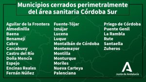 Aguilar de la Frontera, Almedinilla, Baena, Benamejí, Cabra, Carcabuey, Castro del Río, Doña Mencía, Espejo, Encinas Reales, Fernán Núñez, Fuente-Tójar, Iznájar, Lucena, Luque, Montalban de Córdoba, Montemayor, Montilla, Monturque, Moriles, Nueva Carteya, Palenciana, Priego de Córdoba, Puente Genil, La Rambla, Rute, Santaella y Zuheros, en Córdoba.