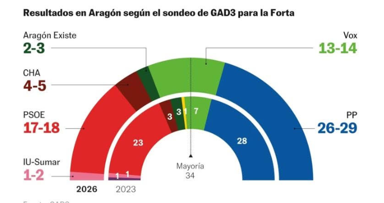 Las elecciones autonómicas de 2026 en Aragón han dejado un escenario político fragmentado: el PP se queda entre 26 y 29 escaños sin mejorar 2023, Vox se convierte en socio clave, el PSOE pierde votos hacia CHA e IU-Sumar, Teruel Existe resiste y el PAR se hunde.