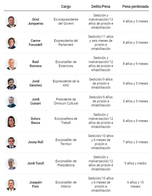 Los Reales Decreto perdonan las penas, todas ellas cumplidas en sus tres primeros años, pero mantiene las inhabilitaciones especiales para el ejercicio de cargo público. los compañeros y compañeras del periódico El Confidencial han elaborado una tabla resumen donde se ve claramente cual es la situación de cada uno de los indultados: