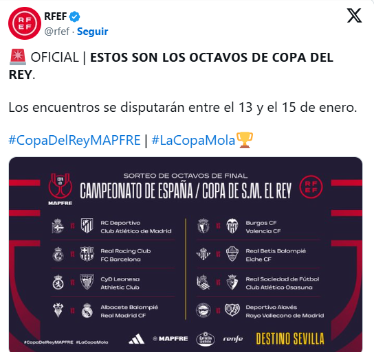 El Burgos CF competirá con el Valencia en El Plantío, el Real Betis recibirá al Elche en La Cartuja, la Real Sociedad jugará en el Reale Arena ante el CA Osasuna y el Deportivo Alavés lo hará en Vitoria frente al Rayo Vallecano. Los encuentros se disputarán entre el 13 y el 15 de enero.