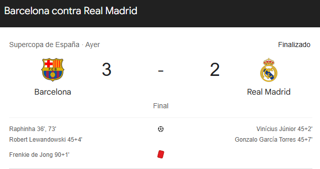 Pese a jugar en superioridad numérica, el Real Madrid no estuvo acertado en las últimas ocasiones y no logró forzar la prórroga. Con el pitido final, el Barcelona levantó su 16ª Supercopa de España, con Raphinha como gran protagonista y MVP de la final, en un partido que también dejó buenas sensaciones para el Madrid por la mejoría mostrada y el despertar de Vinicius.