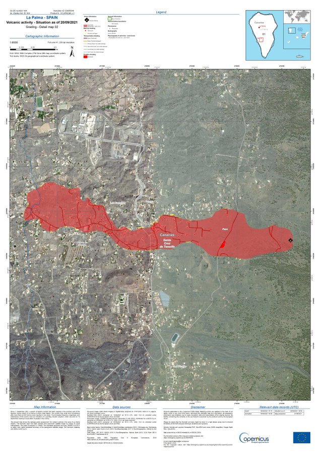 Imágenes tomadas por satélite desde la Agencia Espacial Europea revela que la lava expulsada por el volcán ha cubierto más de 100 hectáreas y así con ellas más de 166 edificios. El lunes por la noche otro terremoto de magnitud 3,8, sacudió la isla sobre las 21.30 de la noche. Poco antes del temblor se había producido un nueva boca eruptiva, siendo así la novena en formarse hasta ahora, lo que obligó a evacuar a los vecinos de la zona de Tacande. La colada del volcán a obligado a evacuar a más de 6.000 personas. La lava ha reducido su velocidad de movimiento por lo que se espera que la colada y ríos de lava lleguen al litoral en la maña del martes 21 de septiembre.