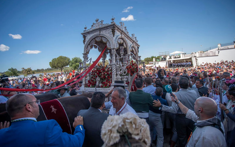 La aldea rociera ha recibido una gran afluencia de peregrinos para la segunda jornada de presentación de las hermandades ante la Virgen de El Rocío. Estas presentaciones ante el Santuario, que comenzaron el pasado viernes en orden inverso de antigüedad, continúan este sábado desde las 12,00 horas. Durante la jornada, casi 80 corporaciones filiales se postrarán ante la Puerta Mayor. Además, esta medianoche se rezará el Santo Rosario, conocido como ‘de Almonte’, siguiendo el itinerario tradicional y presidido por el simpecado de la hermandad Matriz.