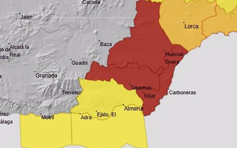En concreto, la Aemet ha elevado este domingo a rojo el aviso de 09,00 a 17,59 horas en parte de la provincia de Almería por «riesgo extremo por lluvias», concretamente en la zona del Levante, Valle del Almanzora y Los Vélez, y Nacimiento y Campo de Tabernas, en las que se espera un total de 60 litros por metro cuadrado en una hora. Asimismo, se pueden alcanzar 110-120 litros en doce horas, con posibilidad de alcanzar acumulados superiores en algunos puntos. Estas comarcas permanecerán bajo aviso naranja por tormentas hasta esta misma hora de la tarde.