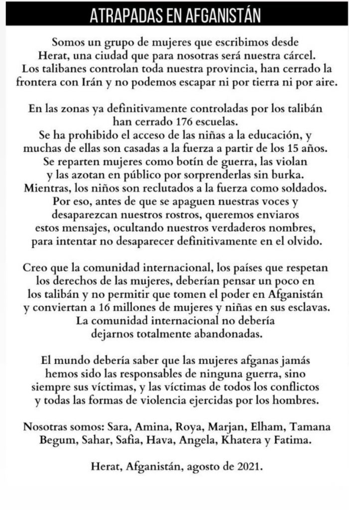 Lo que está sucediendo en Afganistán es asunto de todos, cuando se le arrebatan derechos y libertades a mujeres en cualquier parte del mundo es una amenaza para todos. No podemos quedarnos impasibles ante tanto sufrimiento de mujeres y niñas afganas tras un gobierno que elimina sus libertades y derechos. Las mujeres afganas lo están perdiendo todo nuevamente. Hoy las mujeres de Afganistán vuelven a estar a merced de Talibanes.